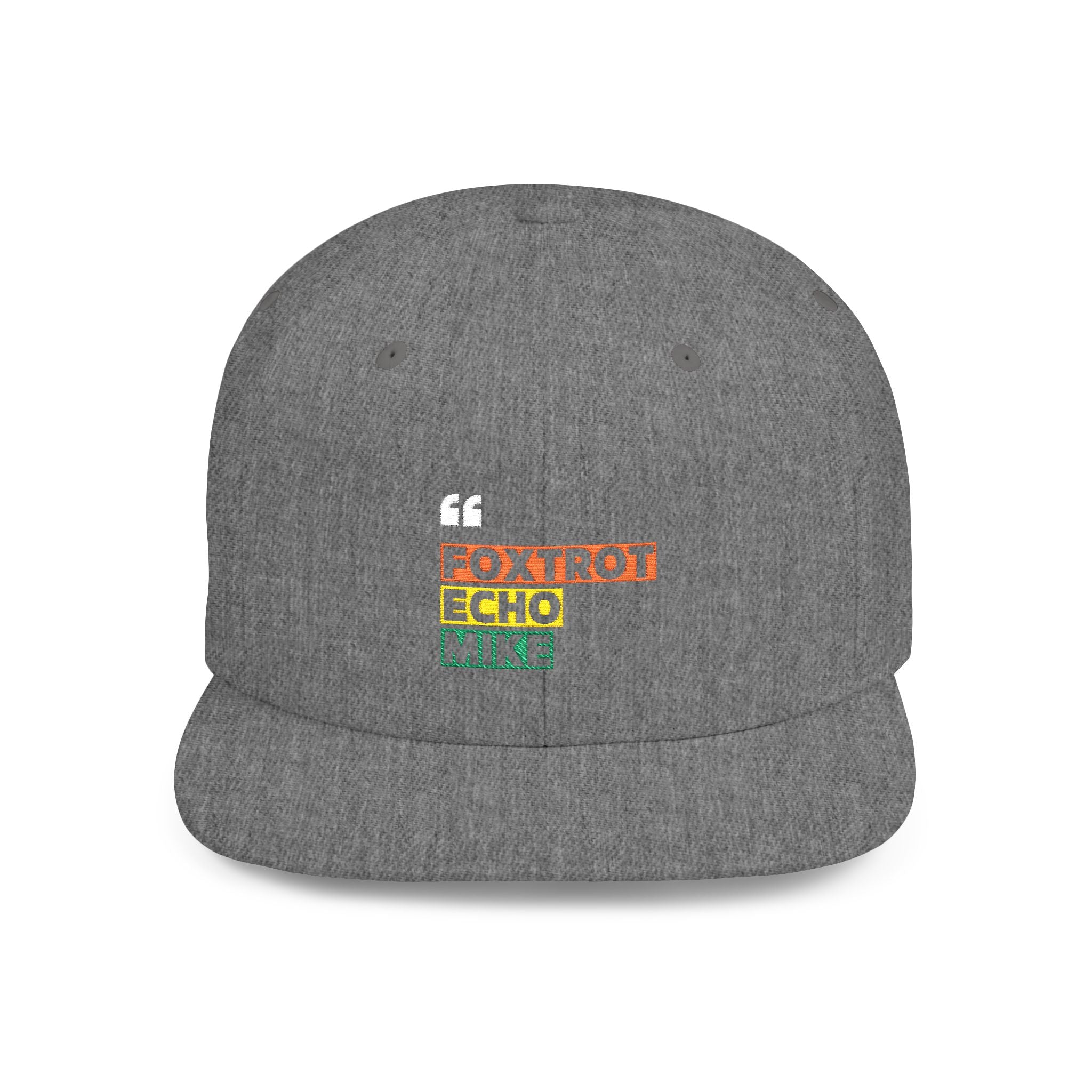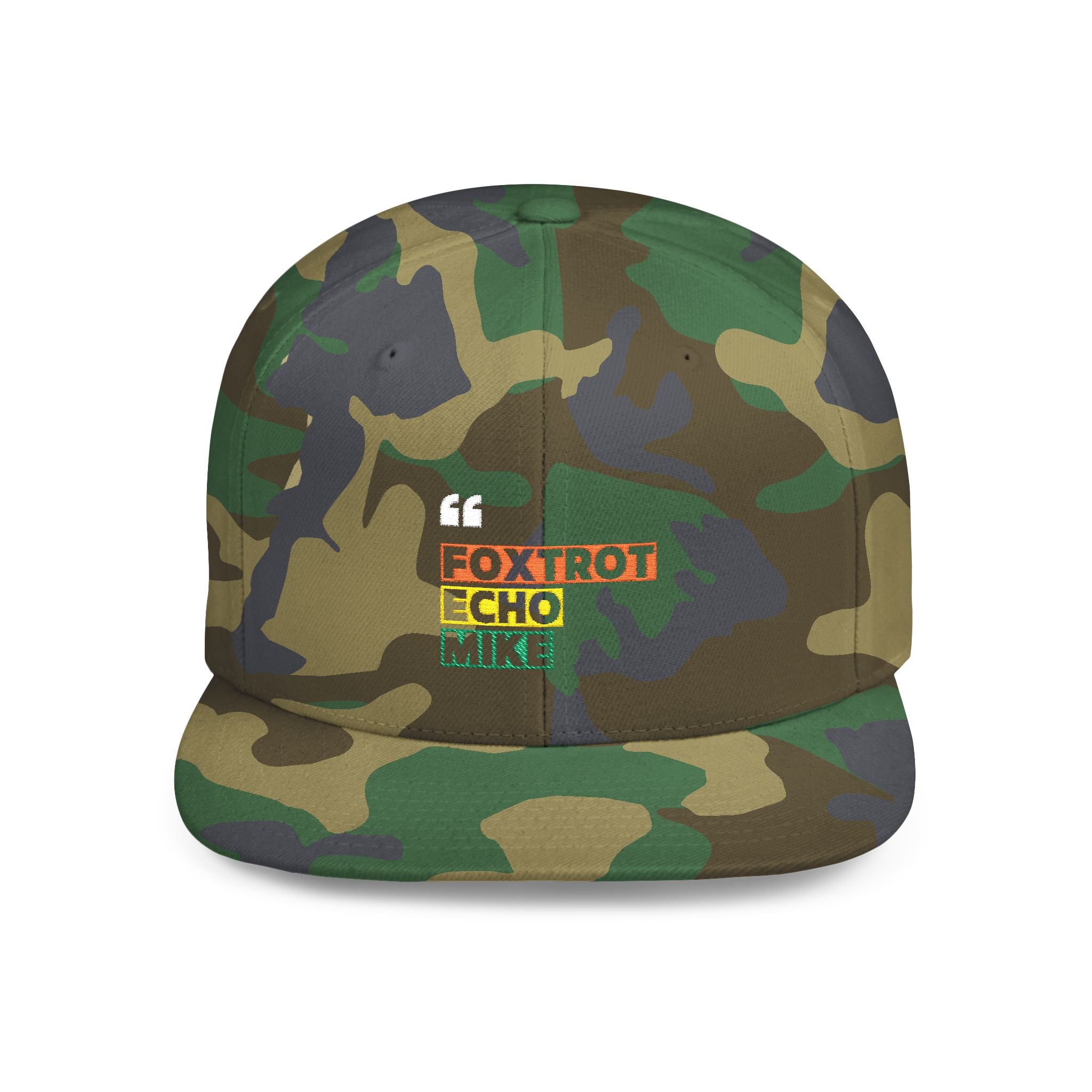 🧢 Foxtrot Echo Mike Flat Bill Snapback | One Size Fits Most | Black • Black/Teal • Dark Heather • Black/Red • Green Camo • Black/Silver